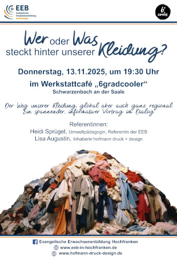 Wir in Deutschland kaufen etwa 60 Kleidungsstücke im Jahr. Kleidung ist schön, sie verleiht uns Ausdruck und Lebensfreude- aber zu welchem Preis? Das Modekarusell dreht sich immer schneller und in der Textilindustrie läuft es längst nicht mehr rund. Entlang der textilen Herstellungskette schwelen viele Konflikte. Menschenrechte und Umweltstandards sind nicht gewährleistet. Es lohnt sich, genauer hinzuschauen. Der Abend bringt uns ins Gespräch über den Weg unserer Kleidung vom Baumwollfeld in unseren Kleiderschrank. Wir machen einen „Label-Check“, denn als Verbraucherinnen können wir noch viel mehr Einfluss nehmen.