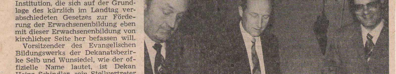 Das Evangelische Bildungswerk Selb/Wunsiedel gehörte zu den ersten Institutionen dieser Art im Kirchenkreis Bayreuth. Das Aufgabengebiet umfasste etwa 70 000 Gemeindeglieder – pro Gemeindeglied zahlten die Kirchengemeinden einen Mitgliedsbeitrag in Höhe von einem Pfennig.